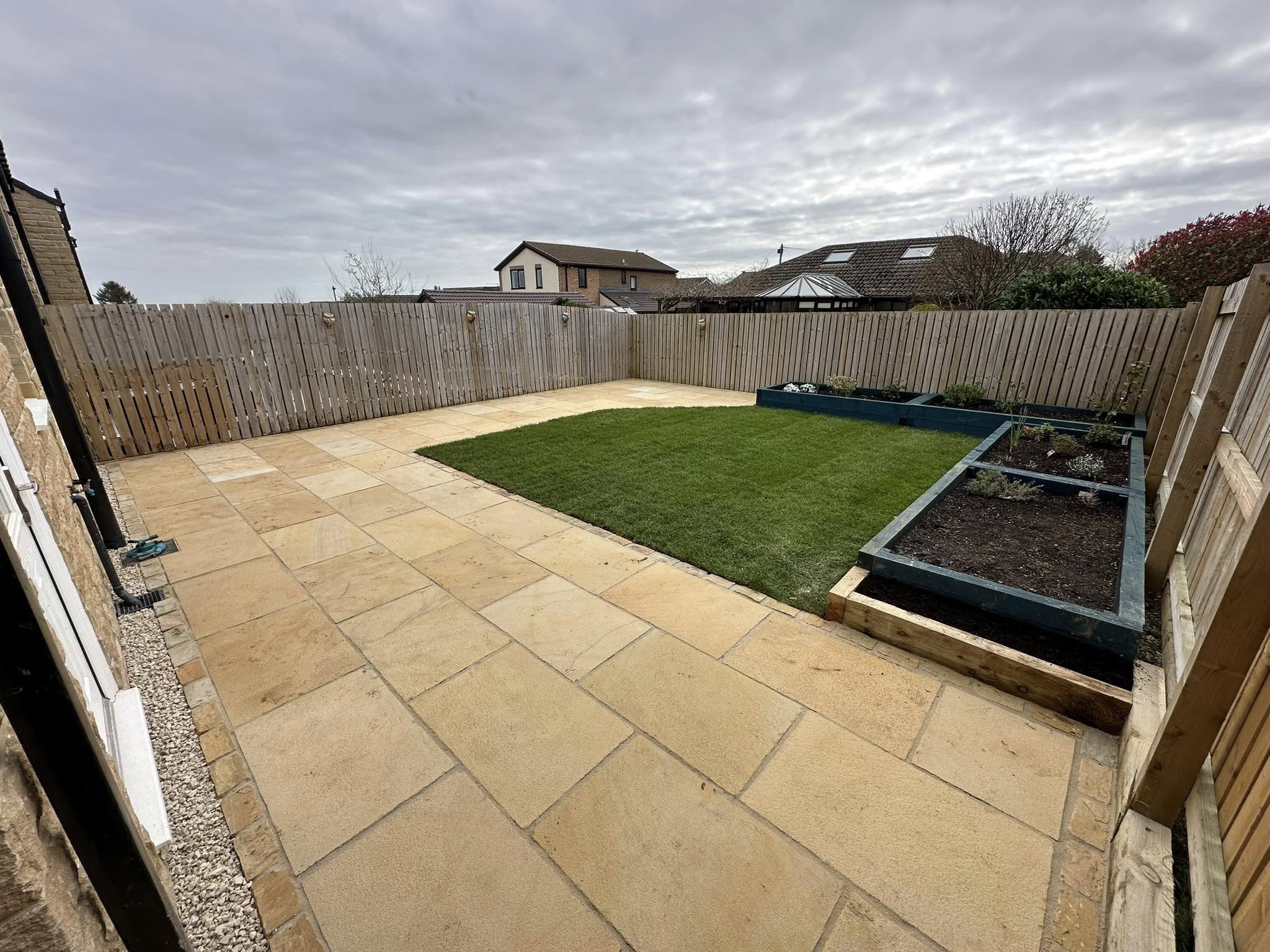 With a new lawn, grey indian sandstone flagstones with matching cobbles, and timber decoration.