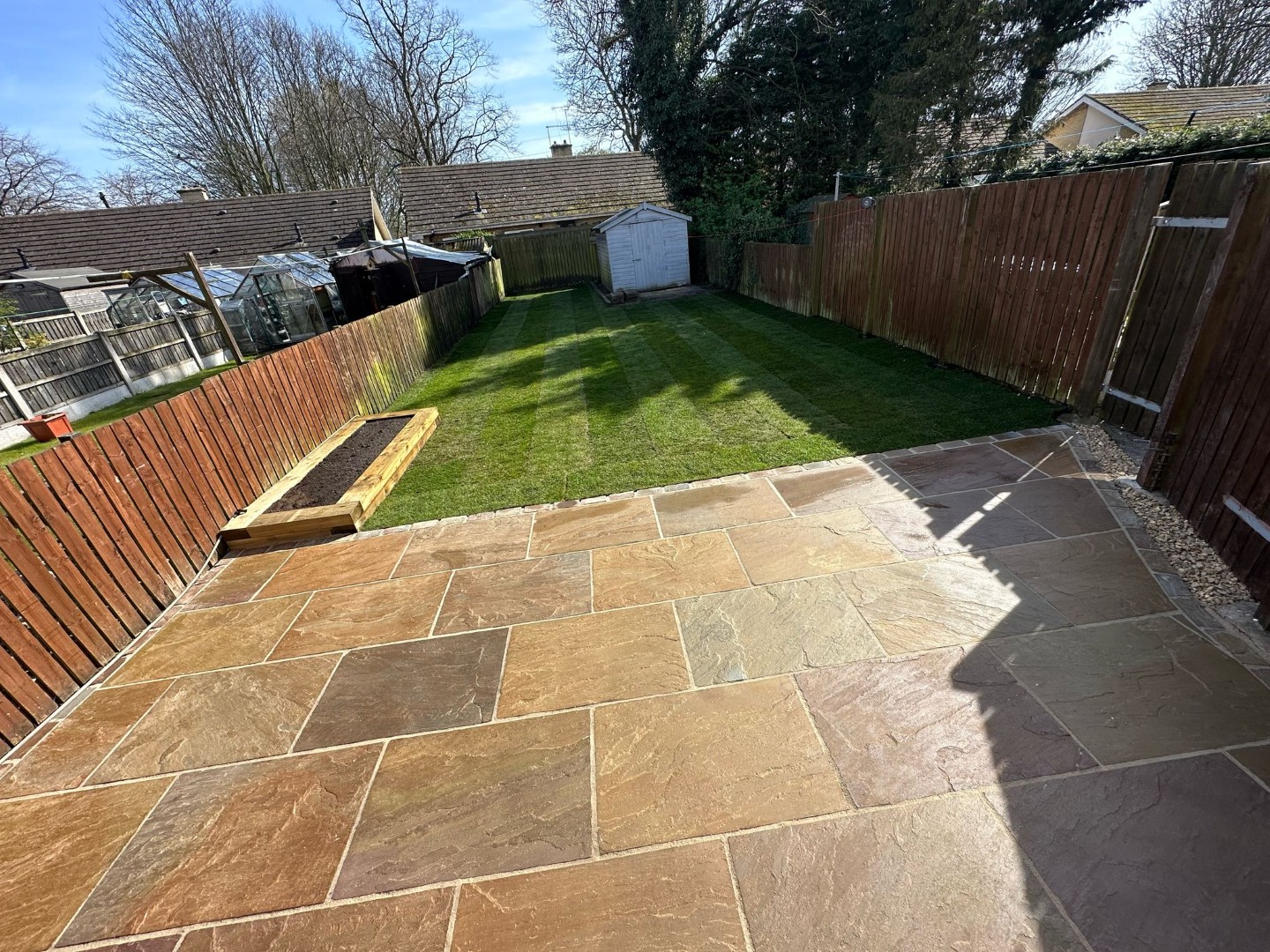 Old patio and gravel rip out, new lawn, indian sandstone paving, sleeper, and lawn.