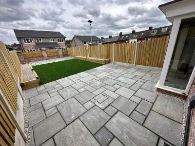 With a new lawn, grey indian sandstone flagstones with matching cobbles, and timber decoration.
