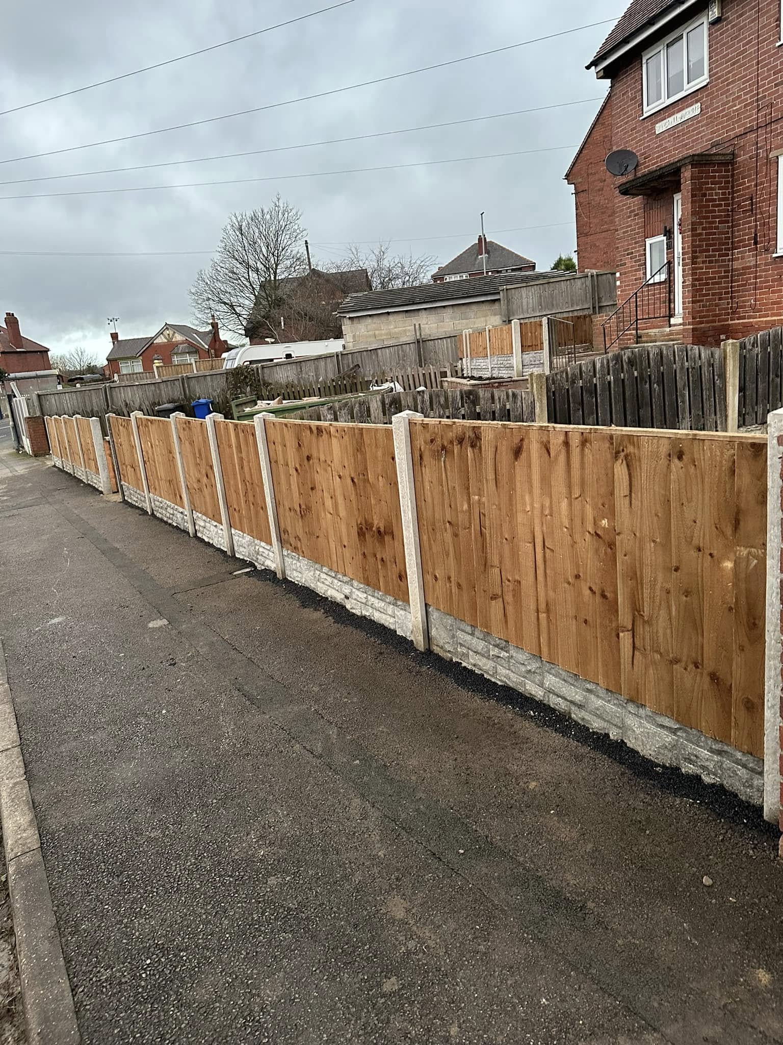 Old hedge and posts out replaced with concrete posts and gravel boards, with a finished brown feather edge pannel.