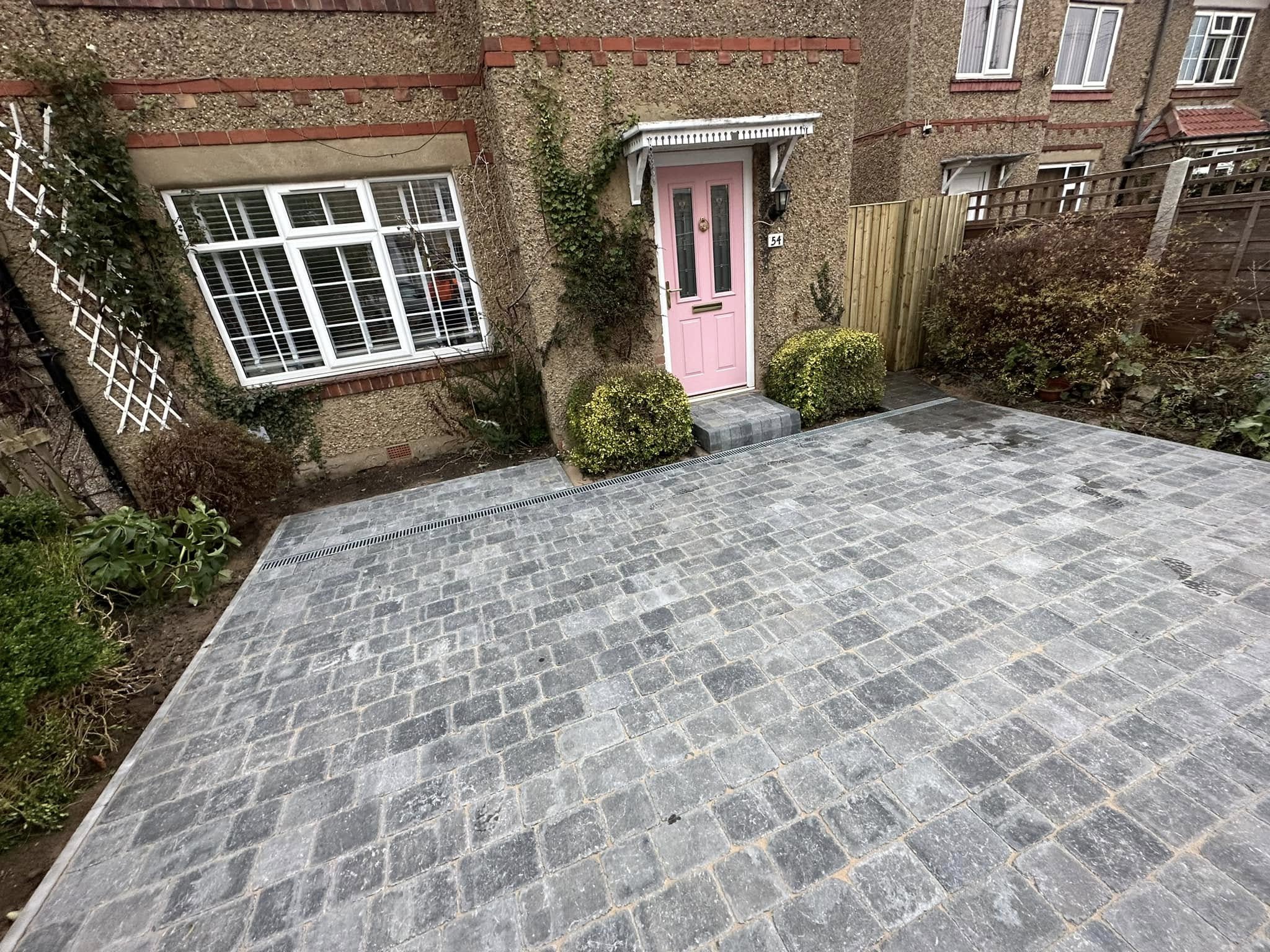 Concrete rip out, black sandstone cobble sets, and new drainage system.